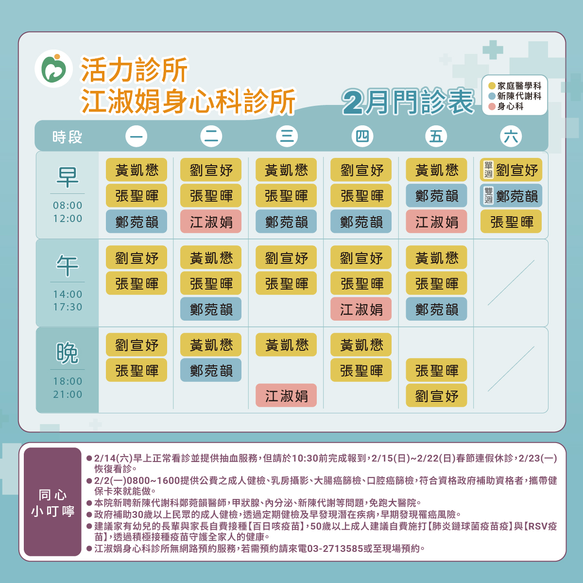 ▶提醒:江淑娟身心科診所採專人預約制度03-2713585,恕無網路預約服務,請來電或至現場預約。